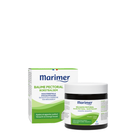 Composé d’huiles essentielles Bio, dont celles d’Eucalyptus globuleux, Ravintsara et Menthe arvensis, le Baume Pectoral Bio MARIMER apporte apaisement et confort par un massage en douceur. Sa texture de crème au beurre de karité, non grasse et non collante permet une application facile et agréable.